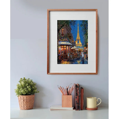 Experience the romantic ambiance of 'Night at the Eiffel Cafe' - a charming Clementoni puzzle that captures the enchanting atmosphere of a Parisian café with the illuminated Eiffel Tower in the background. This premium quality 500-piece puzzle features a beautiful evening scene with warm café lights, elegant architecture, and the iconic Eiffel Tower glowing against the night sky.